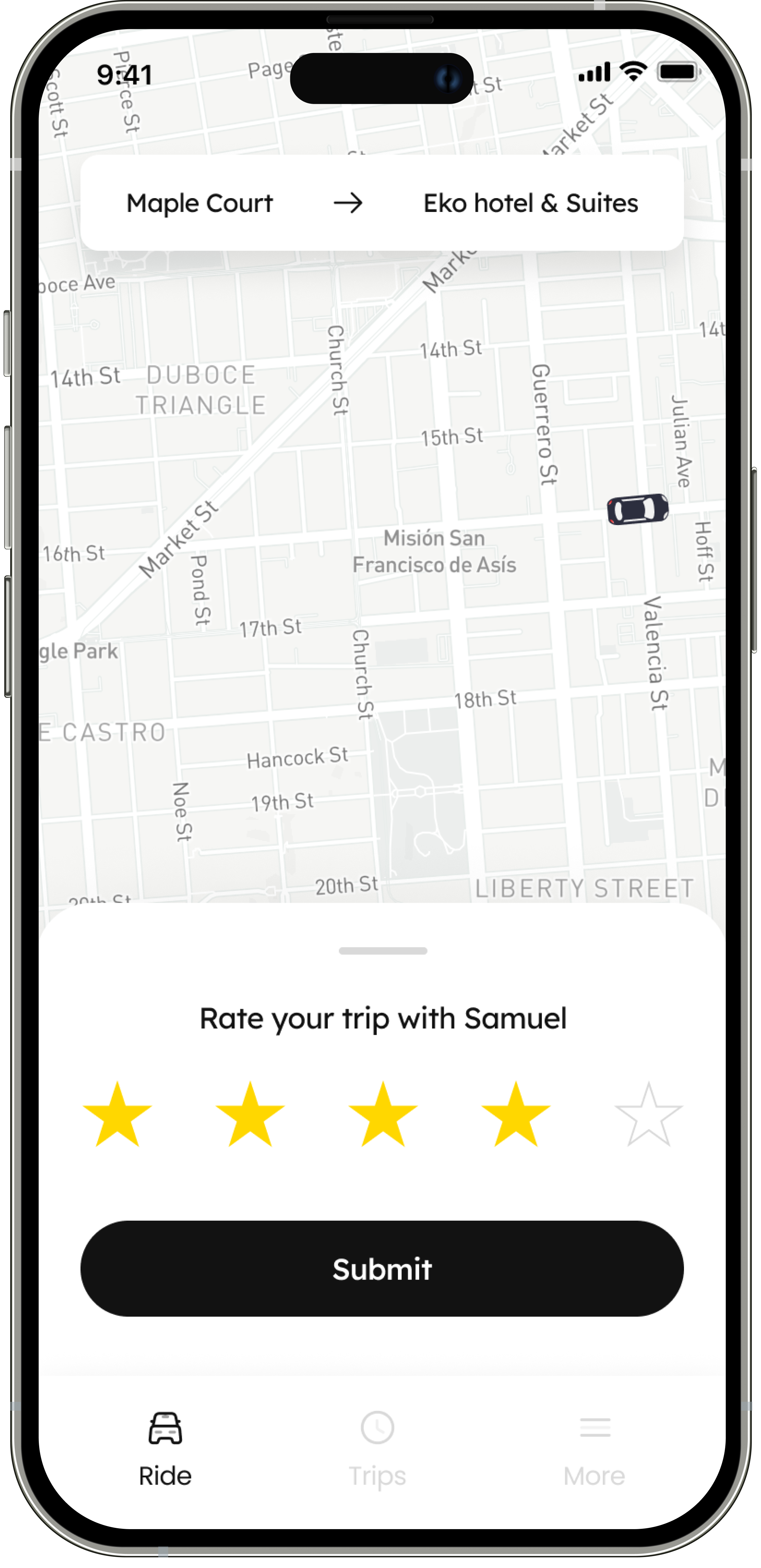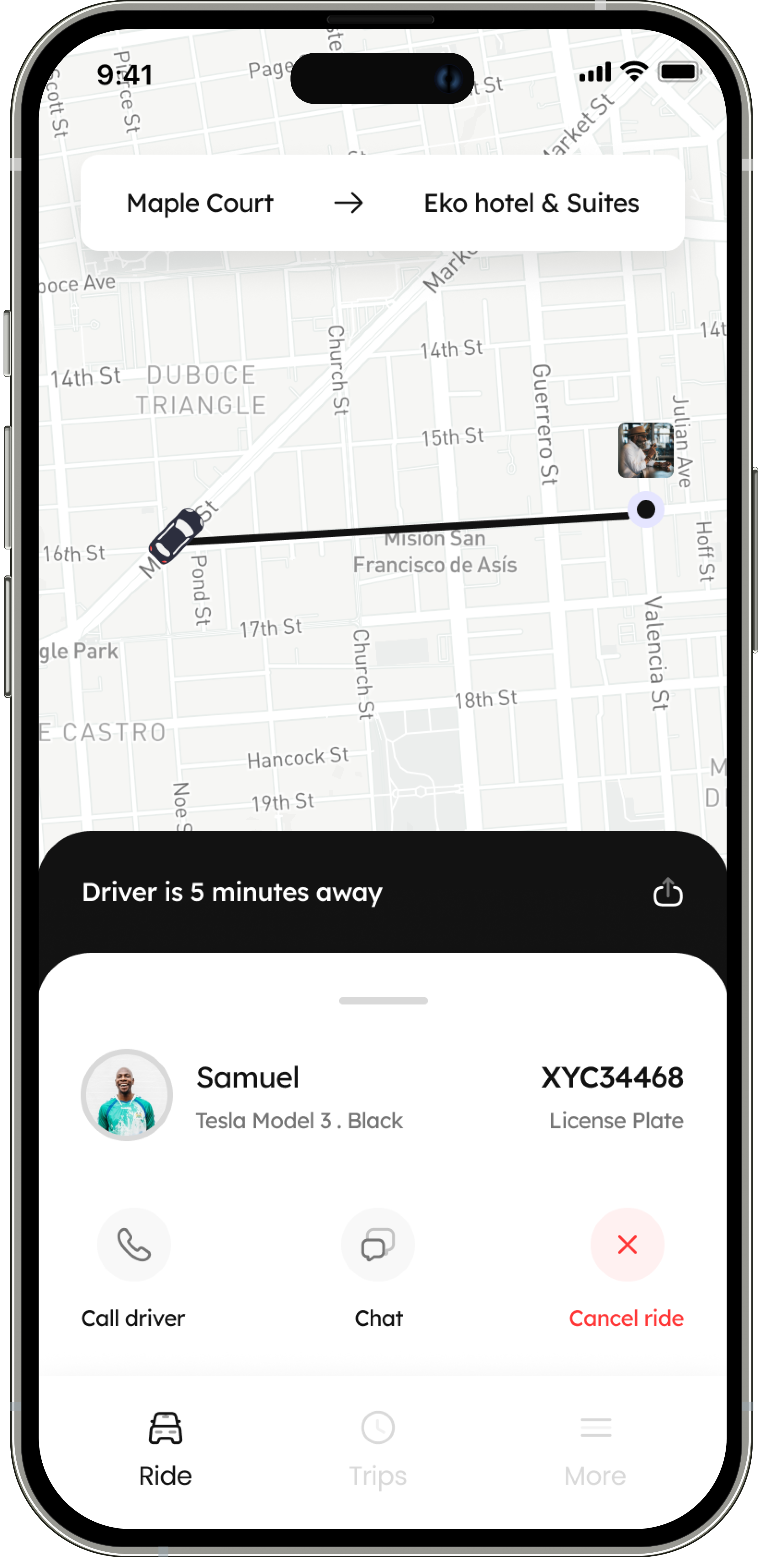 Track your driver's arrival in real-time and verify the vehicle details before boarding.